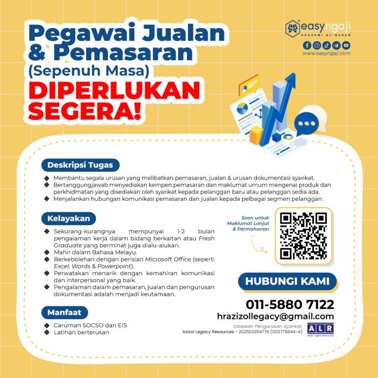 - Berpengalaman dalam bidang pemasaran, jualan, khidmat pelanggan dan pengurusan dokumentasi adalah menjadi keutamaan.